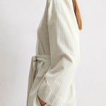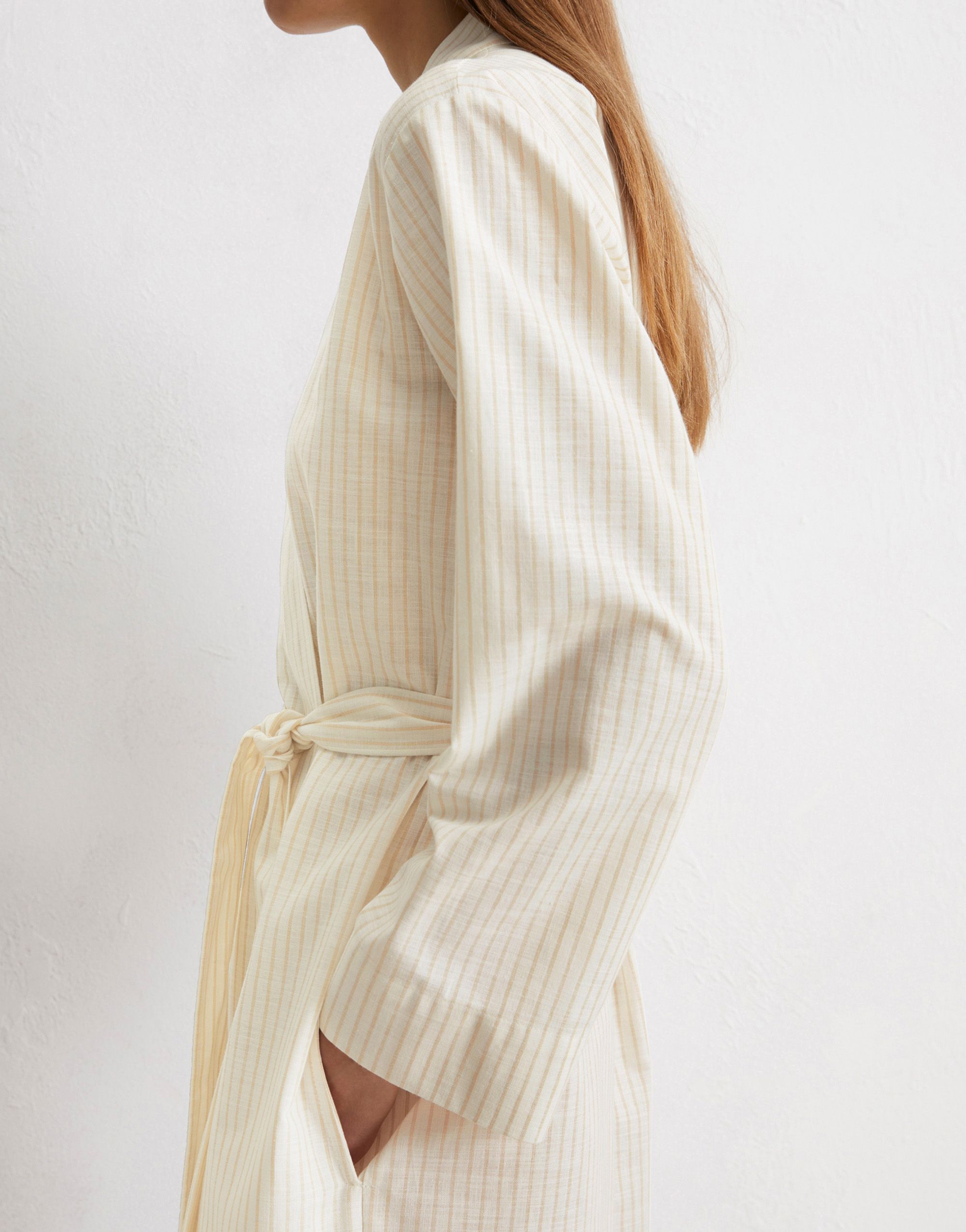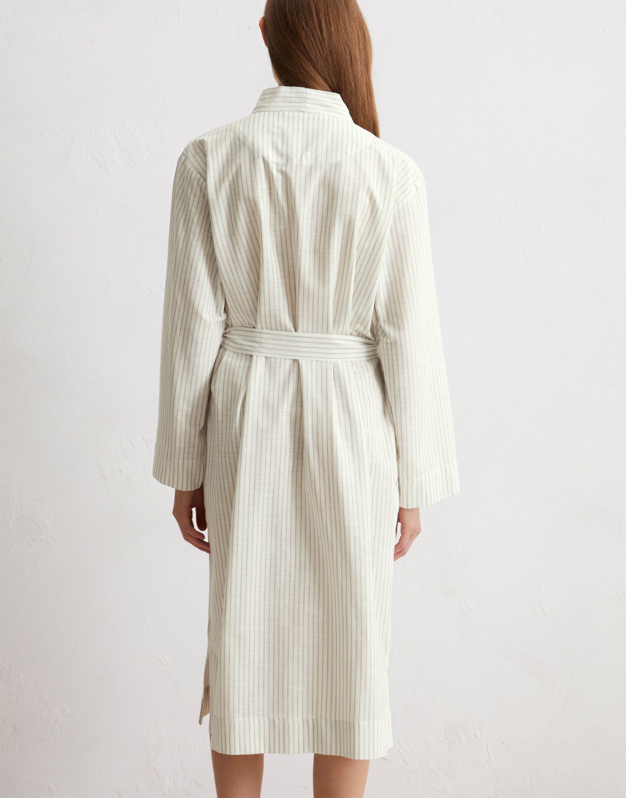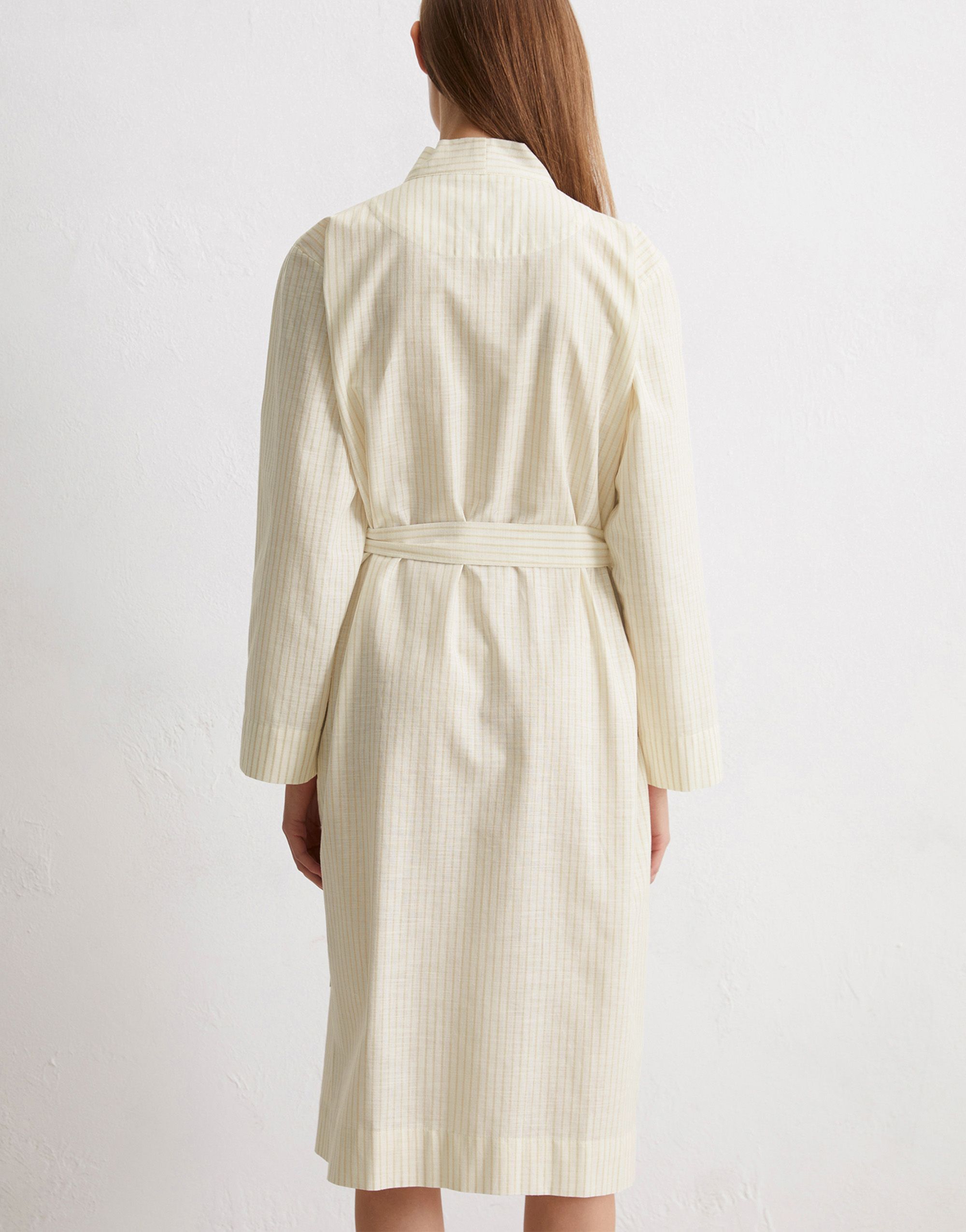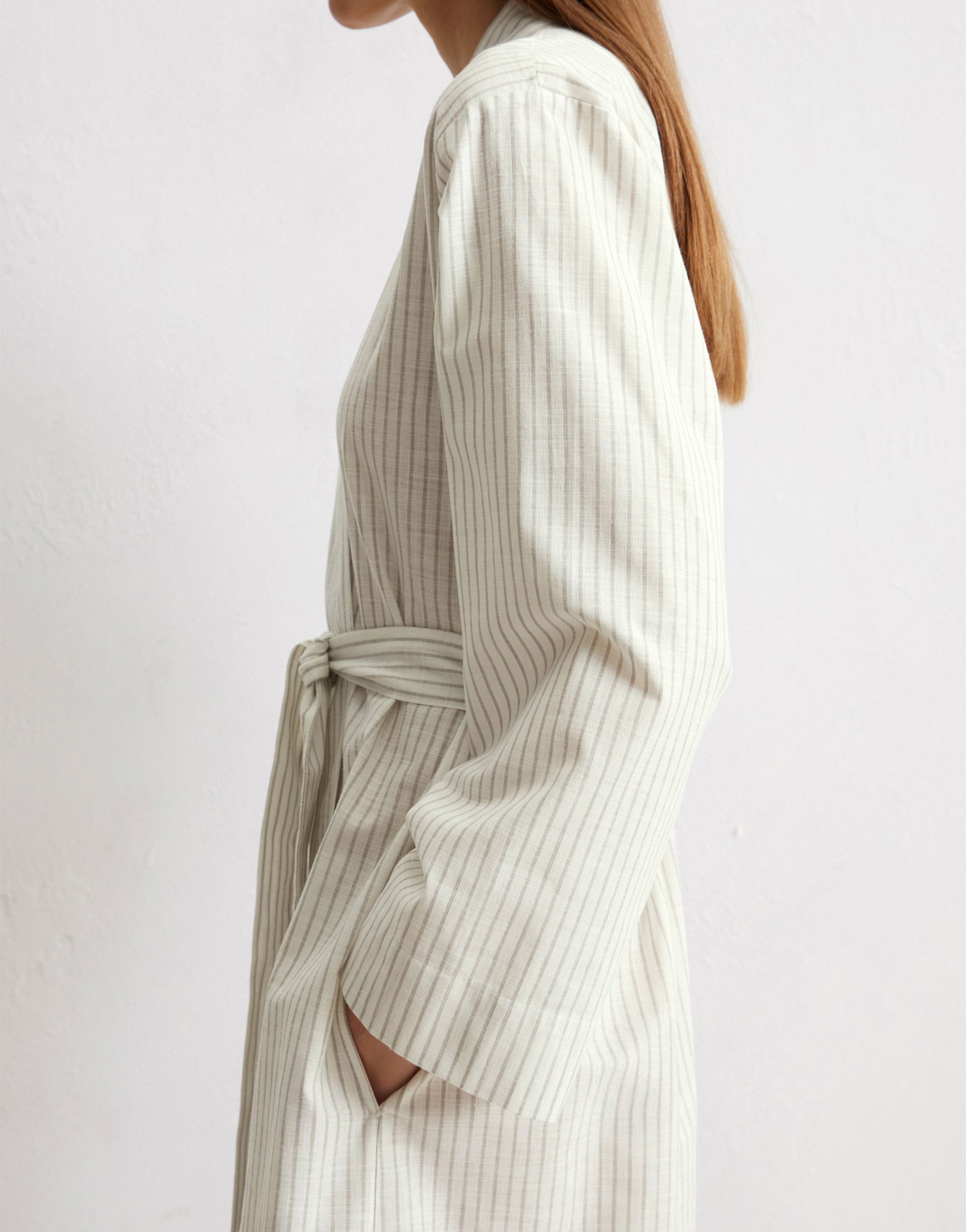 חלוק רחצה נצחי עם אווירה קיצית ורעננה. פסים עדינים מעניקים מראה קלאסי, ושני כיסים קדמיים יחד עם חגורת קשירה מבטיחים נוחות מקסימלית. הבד הטבעי, בדומה לפשתן, משלב נידוף אוויר עם המגע העדין של כותנה אורגנית, וצבוע בחוטים לגימור מט עדין ומרשים.
